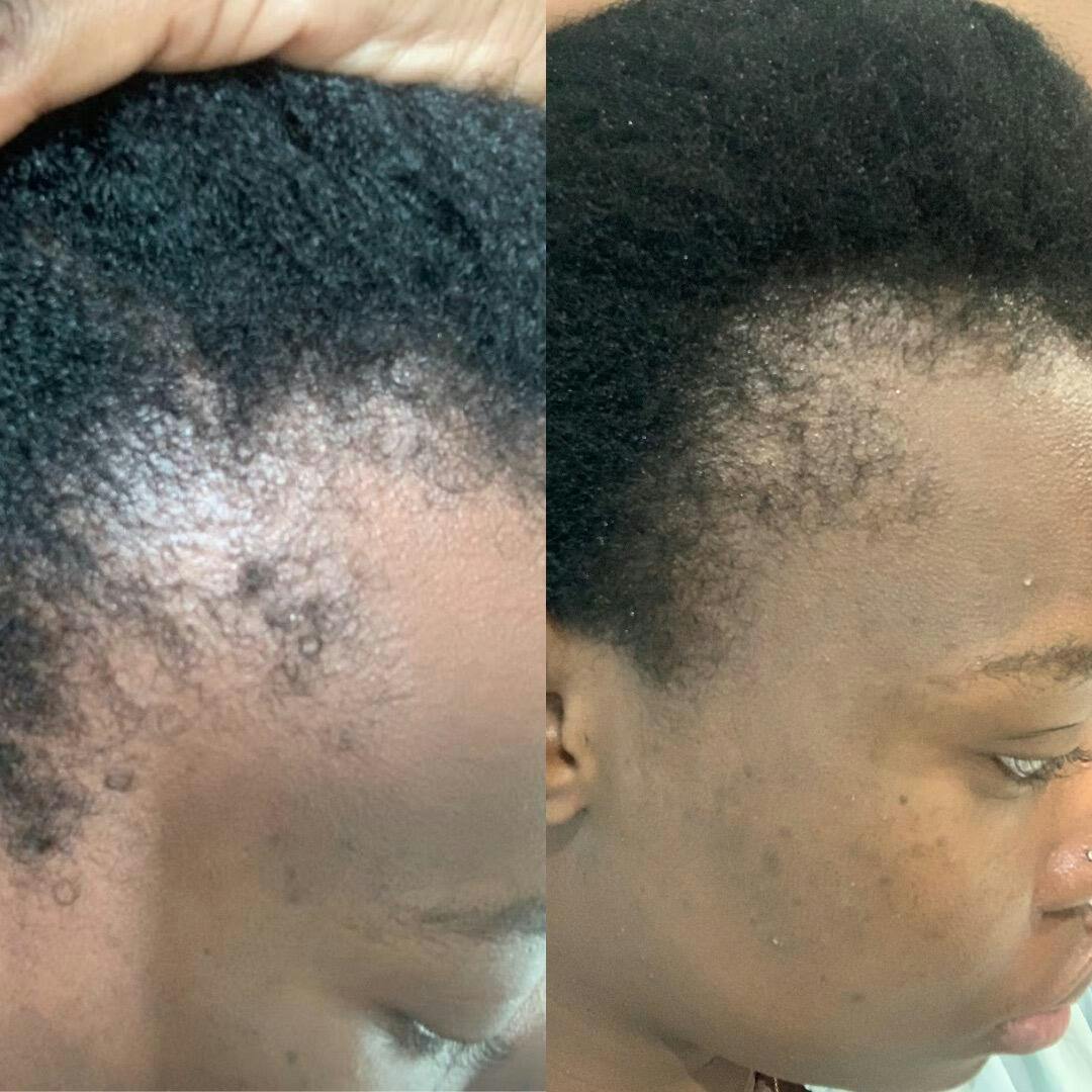 My hair line was so bad! The right side of my edges was thinning out and it got so bad that it looked bald! I’ve been using Bluom and the massager for about 2 months now and there’s a big difference. That bald area is now full of baby hairs! And I‘ve also noticed my hair shedding has drastically reduced. I’m very happy with my results 😍